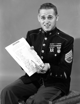 Image shows Marine recruiting Sergeant. Sgt. Robert S. Bailey, posed with paper and pencil. He is a Marine recruiting Sergeant from Michigan, gathering Texas blood for wounded in Korea and for civil defense. Sergeant Bailey, 3213 Wingate, has been stationed here since December. Published in the Fort Worth Star-Telegram evening edition, March 9, 1951.