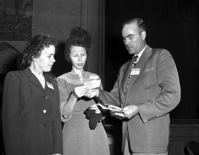 Image shows from left to right, Miss Helen Merserve, Harlington, Mrs. G. A. Mather Jr., Brownsville and Donald L. West, Harlington. They are visitors to the conference of the Texas Council of Church Women. They are shown viewing pictures of their work among Texas migrant farm workers. Published in the Fort Worth Star-Telegram evening edition, March 8, 1951.