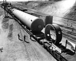 Image shows a 270,000 pound steel tank and base aboard four heavy duty flatcars on Southern freight lines. The train shipment is heading towards Indiana. Three unidentified Railroad men are shown to the left of train. Published in the Fort Worth Star-Telegram evening edition, March 8, 1951.
