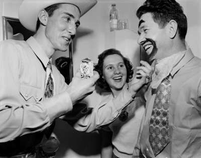 Image shows three Minstrel performers. From left to right, Bobby Dean Marshall, 2710 Hemphill, applying blackface makeup on Marshall Peary, 936 Davis. Center is Carol Ann Reedy, 1203 Clarence, looks on. The three are members of a minstrel show cast sponsored by Morningside Dad' Club. Published in the Fort Worth Star-Telegram morning edition, March 14, 1951.