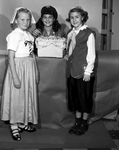 Image shows three Girl Scouts at the Meadowbrook District Girl Scout birthday celebration. From left to right, Mary Eleene Rogers, daughter of Mr. and Mrs. Melvin Rogers, 2800 Bomar, represents Girl Scouts in Holland; Marletta Mallicote, daughter of Mr. and Mrs. T. V. Mallicote, 4531 Martha Lane and Patsy White, daughter of Mr. and Mrs. F. W. White, 5025 Norma, represents Girl Scouts in Poland. Marletta is shown to be holding a birthday cake. Published in the Fort Worth Star-Telegram evening edition, March 9, 1951.