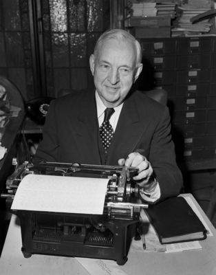 Image shows Reverend L. D. Anderson seated at desk. Anderson is using a typewriter. Behind Anderson is a filing cabinet and telephone. Published in the Fort Worth Star-Telegram evening edition, March 10, 1951.