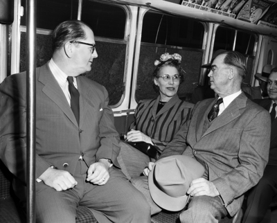 Image shows Mrs. Grace Herdman, center, Fort Worth business woman gets a briefing from Superintendent J. P. Moore on a free bus that took 20 representatives to schools as part of the Public School Week program. Unidentified man on left. Published in the Fort Worth Star-Telegram evening edition, March 8, 1951.