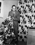 Image shows Donald Howard, winner in Chicago interior decorating contest, in his studio with a sample of tung shan print material he designed for drapes in living room. He is shown holding a sample of tung shan and is in front of tung shan drapes. Published in the Fort Worth Star-Telegram morning edition, March 11, 1951.