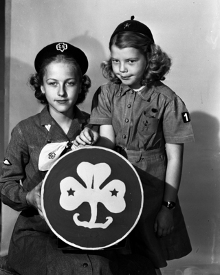 Image shows two Girl Scouts posed with a three leaf clover circle object. From left to right, Barbara Neebauer, daughter of Mr. and Mrs. R. E. Neubauer, 3611 Noble and Brownie Scout Wanda Lee Elrod, daughter of Mr. and Mrs. A. L. Elrod , 3017 Aster. Both contribute to the Juliette Low World Friendship Fund, that was featured in ceremonies of the Riverside and Oakhurst District birthday party. Published in the Fort Worth Star-Telegram evening edition, March 13, 1951.