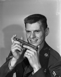Portrait of Corporal Thompson shown with instrument he played on Horace Heidt Opportunity Show. Published in Fort Worth Star-Telegram, evening edition March 19, 1951.
