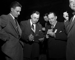 Image shows Gus Jackson, center, chief usher for Billy Graham revival at Will Rogers Memorial Coliseum, discussing seating arrangements with , from left to right, Grady Clark, assistant chief and Woody Griffin, aisle captain. Unidentified man on right. Published in the Fort Worth Star-Telegram morning edition, March 11, 1951.