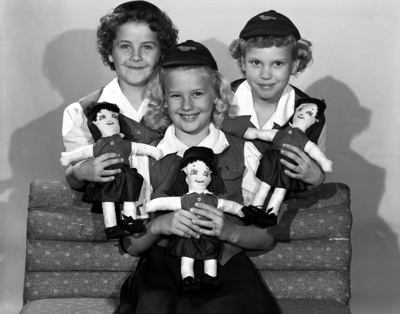 Image shows three members of Bluebonnet Bluebird Troop, Birdville, from left to right, Freda Mae Spurgeon, Judy Taylor and Linda Kay Scott. They are posed holding friendship dolls they made to send to war orphans. A total of 20 dolls were made as part of their birthday week project. Published in the Fort Worth Star-Telegram morning edition, March 11, 1951.
