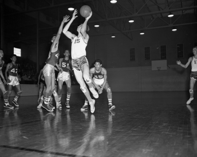 Paschal's Charles Steele gets off shot over Lanier's Joe Casterano. Looking on are Lanier's Oscar Olaque (jersey no. 51) and Alfred Trevino (jersey no. 45). Paschal won, 50-48, advancing to City Conference semifinals. Published in Fort Worth Star-Telegram morning edition March 10, 1951.