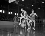 Lamar High School's Tommy Hill leaps over ball in state City Conference cage semifinals against Paschal as teammate Phillip Kidd looks on. Both made all-state quintet as Lamar won title. Published in Fort Worth Star-Telegram evening edition March 12, 1951.