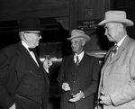 Image shows three men attending the Texas and Southwestern Cattle Raisers Association convention in a Dallas hotel lobby. From left to right, Joe, G. Montague, Fort Worth, association attorney; A. E. Gates, Laredo and W. G. Swenson, Stamford. Published in the Fort Worth Star-Telegram morning edition, March 12, 1951.