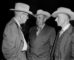 Image shows three men arriving at the Texas and Southwestern Cattle Raisers convention in Dallas. Shown discussing From left to right are, Frank Jones, Marfa, A. G. Seaholm and R. L. Lange, Eagle Lake. Three thousand people are expected to attend. Published in the Fort Worth Star-Telegram evening edition, March 12, 1951.