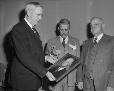 Texas and Southwestern Cattle Raisers Association presented a portrait of G. R. White, Brady rancher and association member to hang in the animal husbandry center at Texas A&M College. Pictured here are Dean C. N. Shepardson, left, dean of agriculture at Texas A&M College; Ray Willoughby, president of the cattle raisers and White. White is board chairman of A&M College. Published in Fort Worth Star-Telegram, morning edition March 16, 1951.