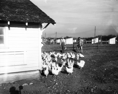 Image shows A. J. Spangler, head of Tarleton agriculture division, left, and W. D. Graves, head of the poultry department, with his son, Roger, check on one of the college's chicken flocks. Published in the Fort Worth Star-Telegram April 1951.