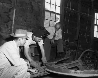 Image shows J. W. Autry, associate professor of agricultural engineering, right, watching James Martin at work in the college shop. Published in the Fort Worth Star-Telegram April 1951.