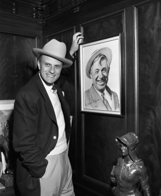Image shows Evangelist Billy Graham posed with hand by picture of Will Rogers. He is shown with a Shady Oak hat presented by Amon Carter. Published in the Fort Worth Star-Telegram morning edition, March 13, 1951.