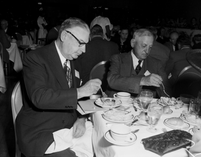 Image shows A. A. Wright, Fort Worth, left and R. M. White, Brady, seated and dining at the Texas and Southwestern Cattle Raisers Association convention. White is chairman of Texas A&M College's directors. Published in the Fort Worth Star-Telegram evening edition, March 13, 1951.