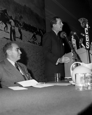 Image shows Governor Shivers speaking behind podium at morning session of the Texas and Southwestern Cattle Raisers Association convention in Dallas. Seated is Allan B. Kline, president of the American Farm Bureau Federation. Published in the Fort Worth Star-Telegram morning edition, March 14, 1951.