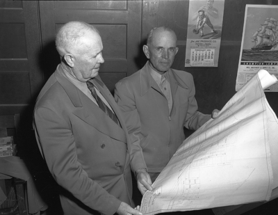 Jim Nix, left, formerly of Fort Worth and now a royalty and lease buyer in Wise County, and Jackie Reed, former Hurler for the Fort Worth Cats, look over city map of Boyd. Read has 20 city lots and a 300-acre farm. Published in Fort Worth Star-Telegram, morning edition March 18, 1951.