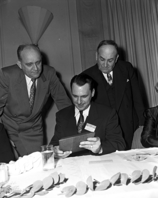 Pictured here is Walter Humphrey, left, and J. M. North, admire the plaque presented to George N. Guthrie, Little Rock, Arkansas. Guthrie was outgoing chairman of the Southern Newspaper Mechanical Conference.