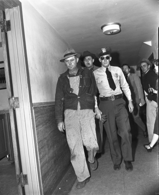 Joe J. Parish, 36, left, one-armed Roanoke farmer, was arrested in connection with the hit and run death of two men in 3600 block of North Main. Traffic Officers T. J. Cassidy, center, and T. W. Curtis made the arrest. Published in Fort Worth Star-Telegram, morning edition March 14, 1951.