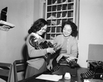 These two Japanese sisters from Mexico City are attending Texas Wesleyan College here, studying journalism. Holding the camera is Shizuko Turu, and leaning on the typewriter watching is Fumiko Turu.
