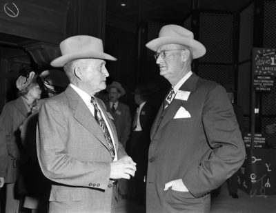West Texans stopped to talk shop in hotel lobbies as the Texas and Southwestern Cattle Raisers Association drew to a close in Dallas. Left to right, Harris Winston of Snyder, chats with F. H. Birmingham of Gail. Published in Fort Worth Star-Telegram, morning edition March 15, 1951.