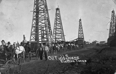 A scene during the early days of development at Electra, which will celebrate the 40th anniversary of the discovery of oil. A funeral procession passes the derricks. Published in Fort Worth Star-Telegram, morning edition March 25, 1951.
