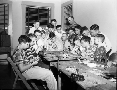 Junior Anglers and instructors brushing up on fly-tying and other fishing lore in preparation for the team shoot to be held in April. Left to right, foreground, Richard Landers, Paul Mason, Dr. R. E. Cook, Guy Austin, Jack Legate, Jack Dunham, Jimmy Neely, Bobby Bigley, Dennis McElhannon and Flynnis Haslett. Standing, Donnie McCaughan, Billy Lamb, Jack Unruh, Charley Bigley, C. L. Manning, Jimmy Lamb, Walter Durham, Carroll Simmons, and Danny Laws.