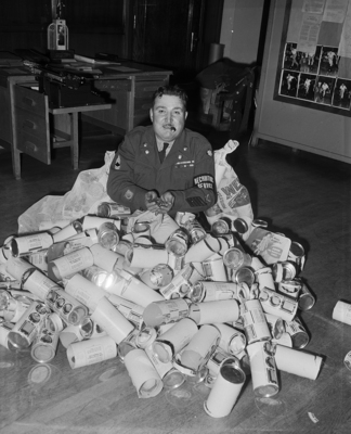 Sgt. 1/c L. G. Mills, surrounded by empty March of Dimes coin collectors, sacked up the bills, checks, and silver that will go to the Tarrant County Chapter of the National Foundation for Infantile Paralysis.