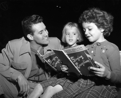 Billy Graham's energetic song leader, Cliff Barrows had 10,000 children saying "uncle". In the picture, Barrows vocalizes on "Jesus Loves Me" with blond Ginn Lu fuller, 5, daughter of Rev. and Mrs. J. Woodrow Fuller of 4008 Lisbon, and Annie Marie Davee, 7, daughter of Mr. and Mrs. L. C. Davee of 863 Chesser. Published in Fort Worth Star-Telegram, morning edition March 18, 1951.