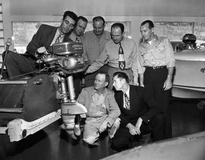 Centered around this outboard motor, these boatmen were part of a group to plan a motor boat marathon race on Eagle Mountain Lake. Standing from left to right, are T.F. Cromer, R. E. Thompson, Ware Higginbotham, Worth Boggeman, and Bill Gunter. Kneeling are Marion Herring and Eddy Orand.