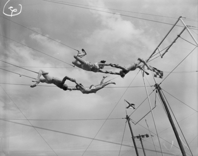 Gainesville Community Circus aerial performers Charles O'Neal and Sarah Gregory, left, and O. L. Rogers and Kay Fellers are shown doing the "double flying return. Published in Fort Worth Star-Telegram, evening edition March 19, 1951.