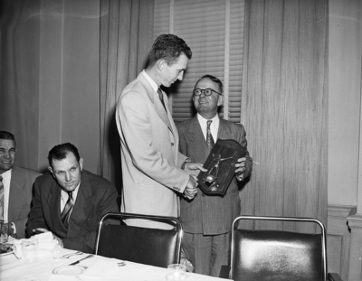 Coach L. R. (Dutch) Meyer presents Grassy Hinton Trophy to Morris Bailey, chosen Frongs' most conscientious player.