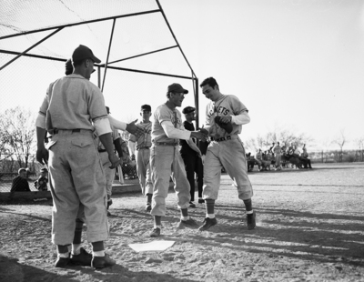 Image shows Arlington Heights, Lou Gillespie, right, getting congratulatory handshake at plate from James Akins after full base home run against Texas Christian University (TCU) freshmen. Arlington Heights won, 9-7. Published in the Fort Worth Star-Telegram evening edition, March 21, 1951.