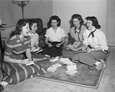 The planning committee of the annual Marian dance at OLV, left to right, are Misses Gladys Scott, Anne Simon, Pat Phillips, Muriel Sgetcorvic and Ada Price. At the dance, OLV "favorites will be presented. Published in Fort Worth Star-Telegram, evening edition March 28, 1951.