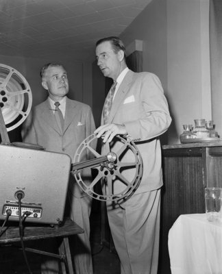 University of Texas Coach Ed Price, right, and Assistant Eck Curtis prepare to show pictures of spring football training to Longhorn Club members at Hotel Texas. Published in Fort Worth Star-Telegram, evening edition March 22, 1951.