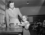 Linda Jo Trimble, first place winner in the Ridglea West Elementary School first grade bird house contest, displays her entry to her teacher, Miss Betsy Dearing. Published in Fort Worth Star-Telegram, evening edition March 21, 1951.