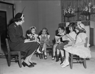 Dressed in their holiday finery four-year old of All Saints Episcopal Church school will observe services for the first time Easter morning in the chapel of the new educational building, Crestline and Pentecost. Left to right, Mrs. Sam Muir, teacher of the class; Jan Perry, 3817 Crestwood Terrace: Julienne Fuller, 4900 Crestline; Jimmy DeWolfe, 4301 Southwest Blvd; Letsy Muir, 1708 Skyline Drive, and Elizabeth Anne Holmes, 4800 Westridge. Published in Fort Worth Star-Telegram, morning edition March 24, 1951.