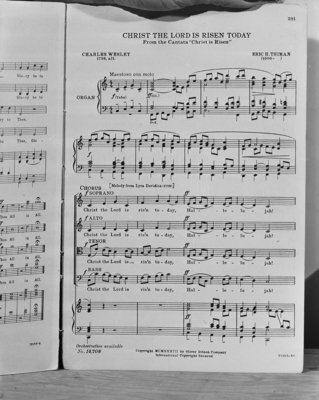 Easter lily and music of "Christ The Lord Is Risen Today". Published in Fort Worth Star-Telegram, morning edition March 25, 1951.
