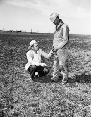 Image shows Burton Hines, Mitchell County farmer, standing, looks over a field of young alfalfa with Eddie Norris, Soil Conservationist Service (SCS) range conservationist. Published in the Fort Worth Star-Telegram June 1951.