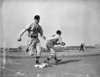 Ohio State's Steward Hein sprints across first with infield hit as TCU's Bill Elliot awaits ball on throw from Shortstop Don Carroll in fifth inning. Ohio State won by 4-2. Published in Fort Worth Star-Telegram morning March 24, 1951.