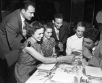 Three Fort Worth guys named Mike are shown with their dates at the Hotel Texas Keystone Room after seeing the movie at the Hollywood Theater, "Three Guys Named Mike" which stars Jane Wyman as a stewardess. The group, left to right, are Bill "Mike" Dinkins, Jean Hill, Sally Hudson, Mike George, Ysleta Leissner, and Sgt. Robert "Mike" Gianerakis of Carswell Air Base. Published in Fort Worth Star-Telegram, evening edition March 26, 1951.