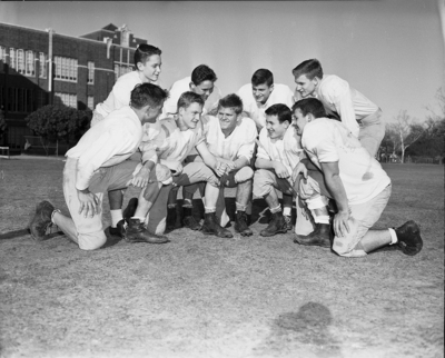 Paschal Football Coach Bill Allen is depending on these lads up from last year's reserve list and B squad to bolster the 1950 Panther eleven. They are, left to right, front, Linemen Duane White, Bill Bogle, Don Griffin, Pat Rambo and Jimmy Talley. Bucks are, top, left to right, Bruce Pike, W. B. Payne, Homa Hill and Weldon Burt. Panthers opened spring grid drills. Football players huddled together and smiling.