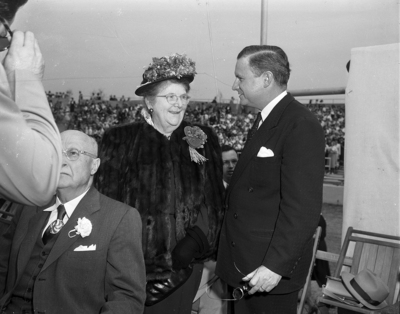 An Austin woman sat on the platform at Amon Carter Stadium and listened to all the speeches but she was prejudiced in favor of one. She was Mrs. Nannie Partlow Daniel, shown with her son, Attorney General Price Daniel. Published in Fort Worth Star-Telegram, morning edition March 26, 1951.