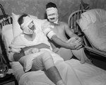 W. M. Skinner, left, assistant chief of Benbrook Volunteer Fire department, and his son, Jow Ed Skinner, lieutenant of the group, are shown in their Harris Hospital room where they are recovering from third degree burns suffered in an Aledo grass fire. Published in Fort Worth Star-Telegram, evening edition March 27, 1951.
