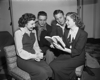 Principals in the Birdville High School senior play, "Kay Beats the Band" to be presented in the school auditorium are, left to right, Annalee Johnson, Glen McQuinn, Jack Connel and Haroldean Martin. Play directors are Mrs. May Della Everett and Kermen Bond. Published in Fort Worth Star-Telegram, evening edition March 28, 1951.