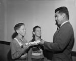 Lt. Benny Bob Woolery, left, and Capt. LeRoy Gleim, center, are representatives of the public school patrol, En who are receiving awards of merit. Charles C. Harter sponsor at Carroll Peak Elementary School is shown presenting the safety certificates that were distributed at Carroll Peak. Officials of the Southwest Motor Club, AAA are furnishing the awards throughout the Fort Worth school system to boys who served as safety patrolmen. Published in Fort Worth Star-Telegram, evening edition March 28, 1951.