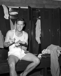 Image shows Texas Christian University (TCU) track member, James Kellett, 220 yard dash specialist with track shoes in hand in locker room. He will compete in the West Texas Relays at Odessa. He won the event in the Southwestern Recreation track meet. Published in the Fort Worth Star-Telegram morning edition, March 29, 1951.