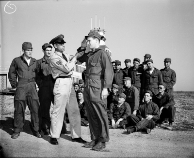 One of the jobs of Technician Sergeant Francis M. Mansir, center, at the Air Force basic training center at Eagle Mountain Lake is to train men how to salute. Here he works with Private Roger Donahue of River Forest, Illinois, right, while Private George Dahm of Crystal Lake, Illinois, and Private William Asay of Westmont, Illinois look on. Part of the basic training detachment watches from the background. Published in Fort Worth Star-Telegram morning edition, April 1, 1951.
